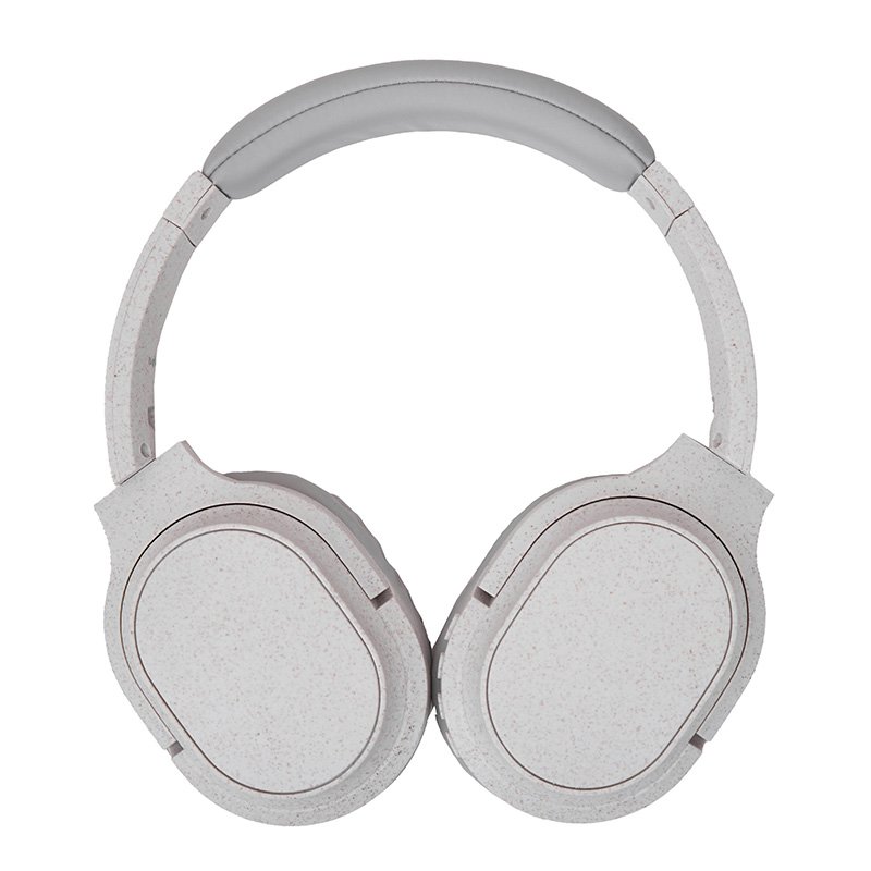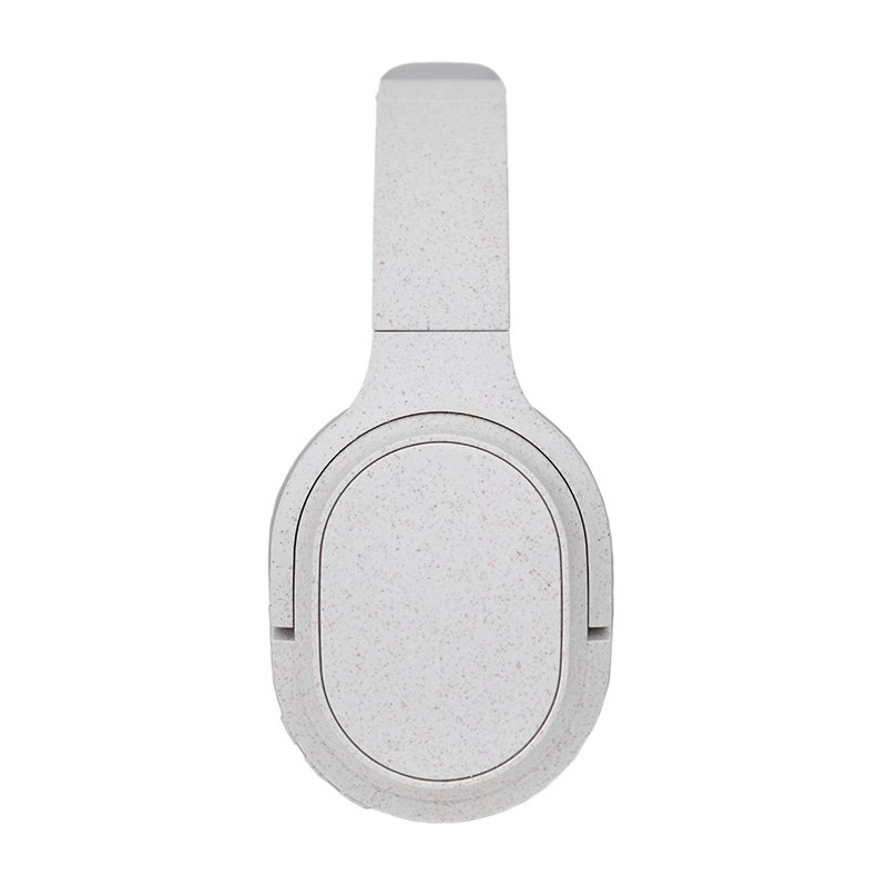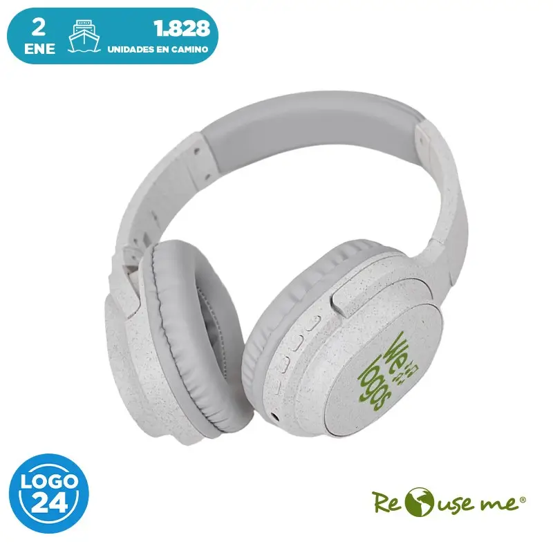 Auriculares inalámbricos estilo diadema, con micrófono incorporado. Realizado en ABS y Wheat Straw, pasta de tallo de trigo, un material sustentable que reduce el consumo de plásticos vírgenes. Cuenta con cobertura bluetooth en una distancia de 10 metros y conector para cable jack de 3.5mm, y ranura para tarjetas de memoria. Incluye cable micro USB de carga. Incluye botones de comando para encender, apagar, retroceder y avanzar.