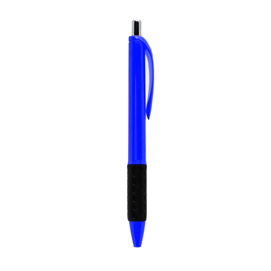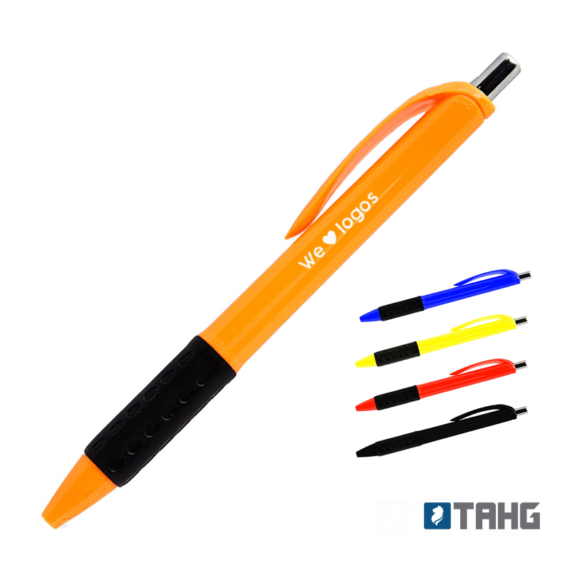 Bolígrafo con cuerpo plástico de color. Grip de goma negro. Pulsador metálico. Retráctil. Tinta negra. Tahg