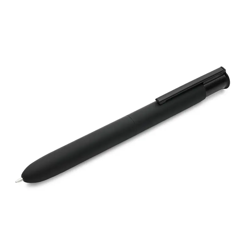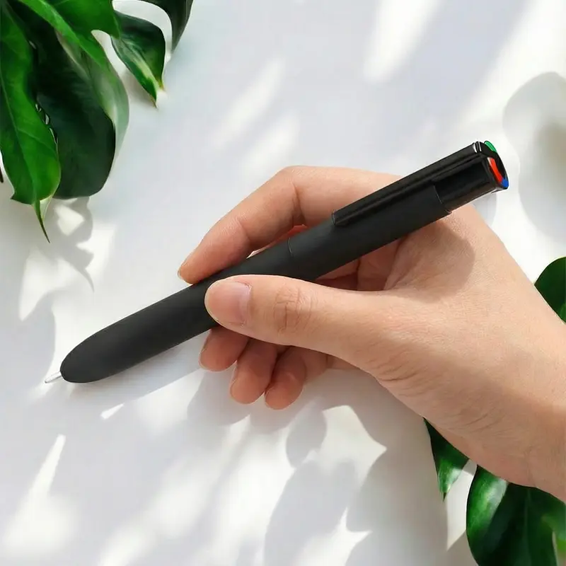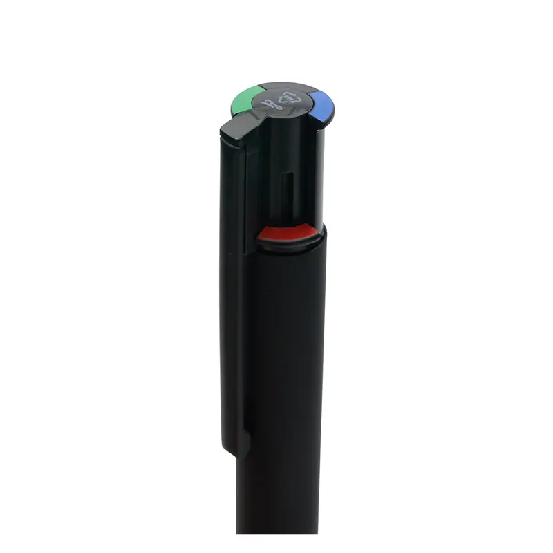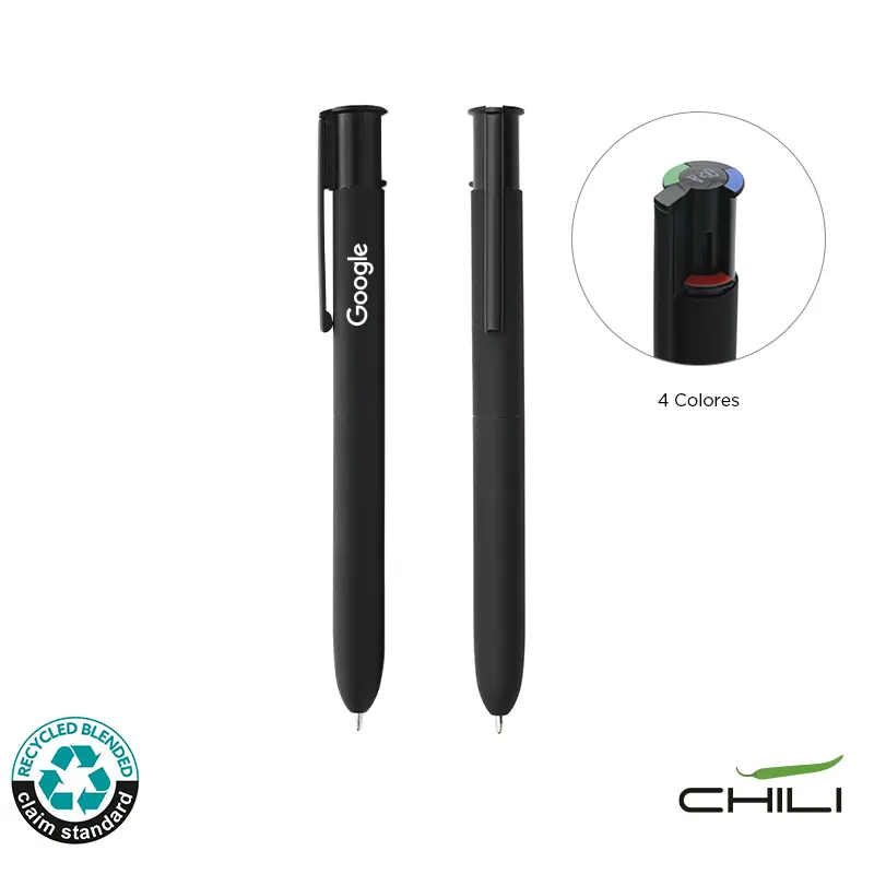 Bolígrafo retráctil de 4 colores fabricado en aluminio reciclado. Hecho con cuerpo de aluminio reciclado, cuenta con un barril ancho para mayor comodidad al escribir, clip plástico resistente y recargas de tinta alemana en negro, azul, rojo y verde que garantizan una escritura fluida y duradera. Es ideal para estudiantes, profesionales y oficinas que buscan un instrumento de escritura práctico, elegante y sostenible.