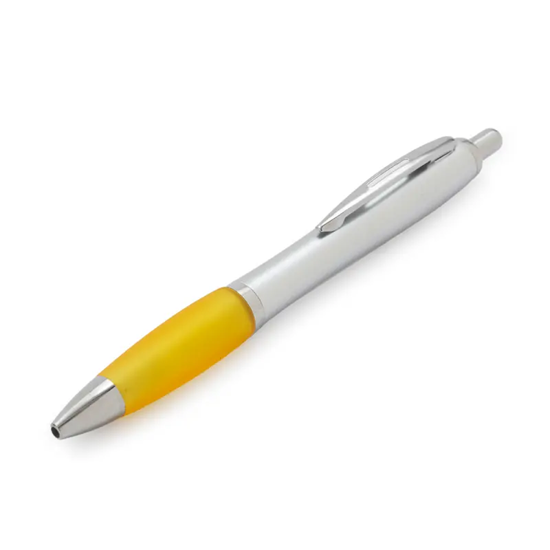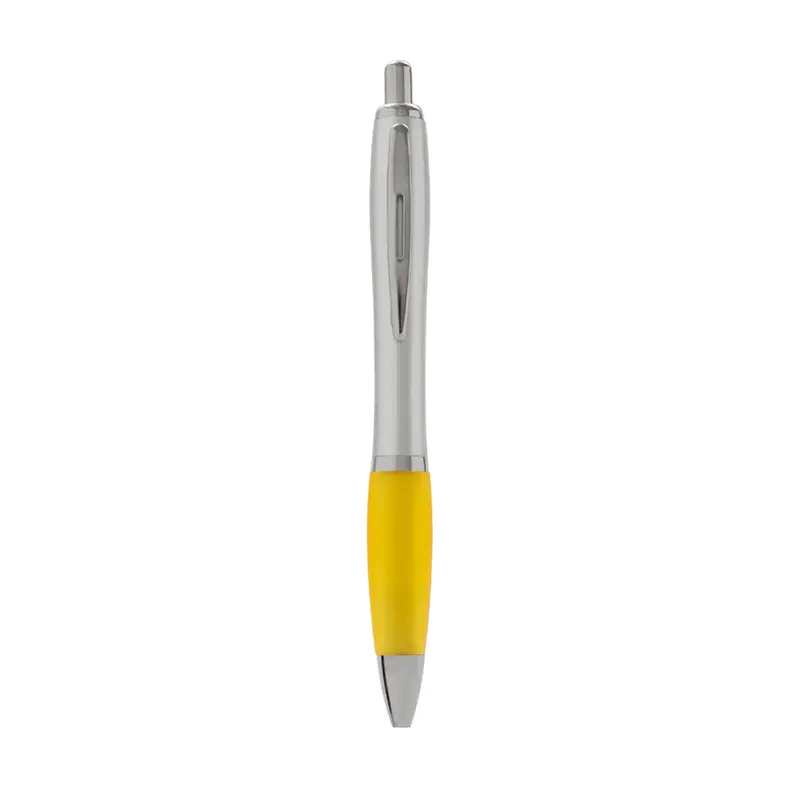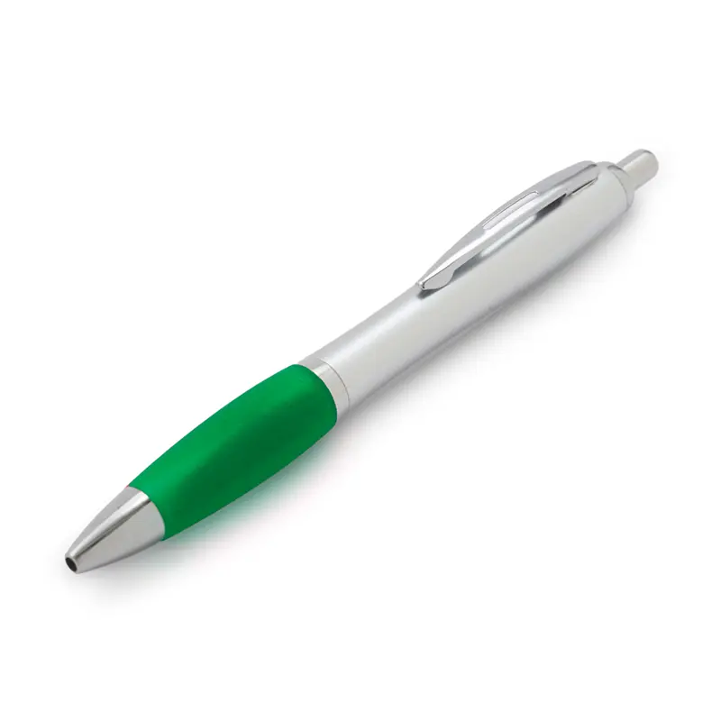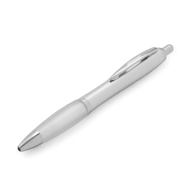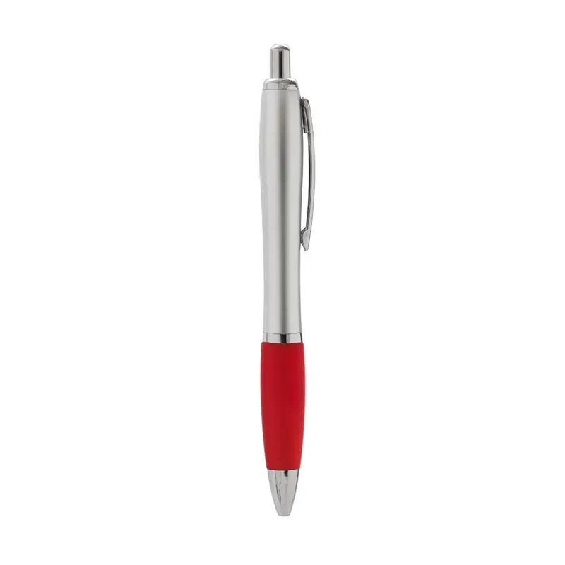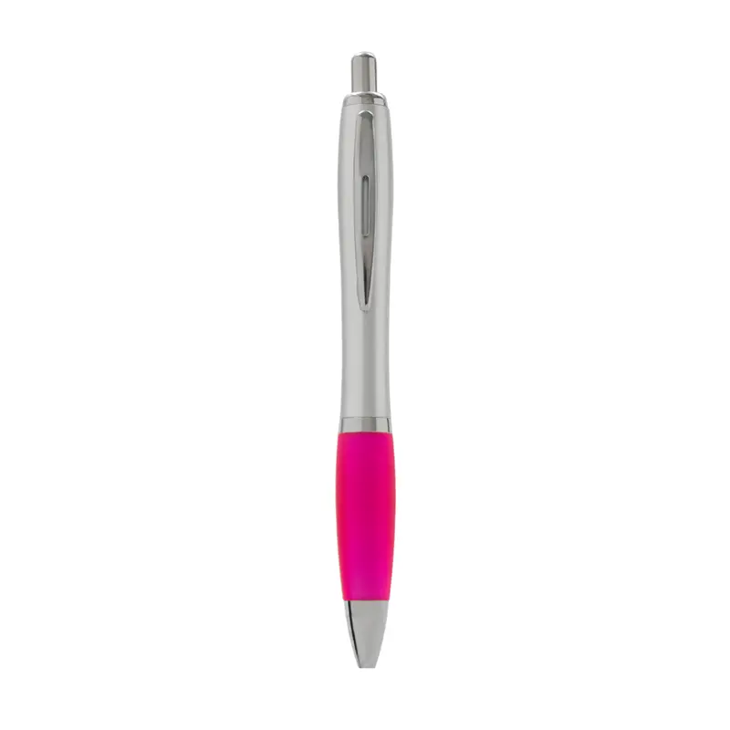 Bolígrafo con cuerpo curvo plástico en acabado plateado. Cuenta con grip de goma de color, clip y botón metálico, mecanismo retráctil y tinta negra. Producto libre de BPA. Tahg