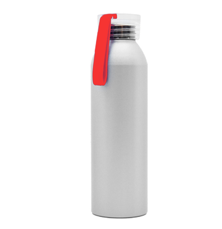 Sport Bottle realizada en aluminio, incluye banda colgante de silicona en colores. Producto aprobado por el I.N.A.L. para el contacto con alimentos.