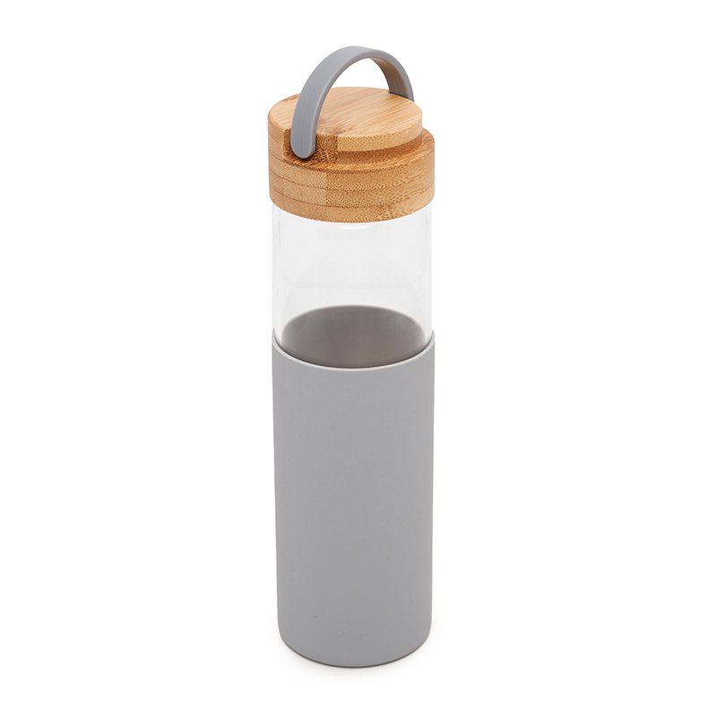 Botella reutilizable de vidrio, con tapa de bamboo y funda de silicona. Cuenta con un agarre en su tapa para su transporte. Producto libre de BPA. Producto aprobado por el I.N.A.L. para el contacto con alimentos. Medidas: 22,6 cm x 6,8 cm (Altura x Diámetro). Capacidad: 550ml.