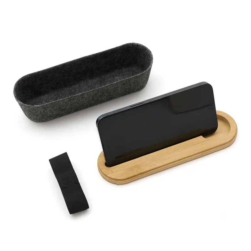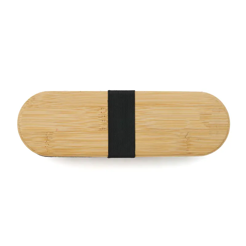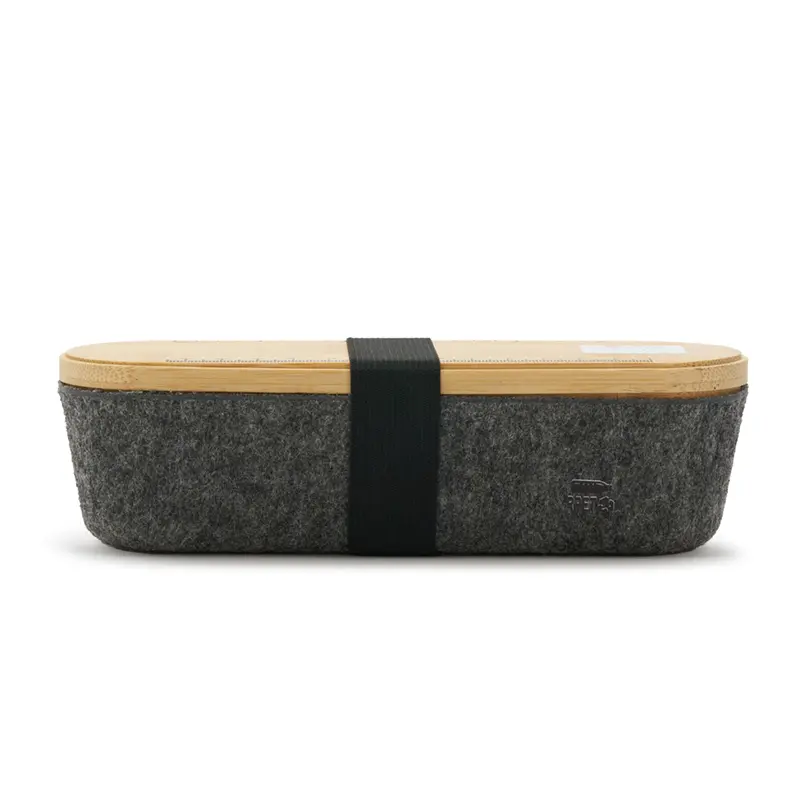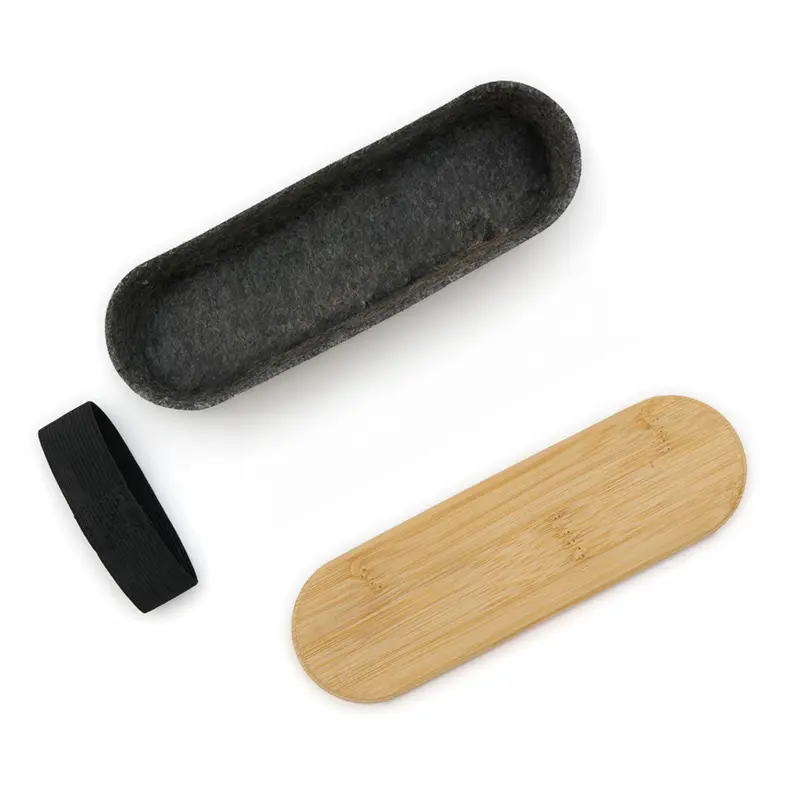 Estuche ideal para ser utilizado como cartuchera o portaobjetos. Está confeccionado en fieltro RPET reciclado y tapa de bambú natural, lo que la convierte en una opción sostenible, resistente y con un diseño moderno. ReUseMe.