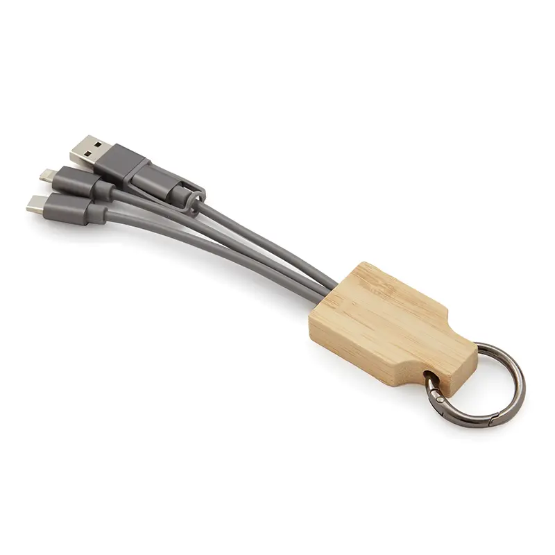 Es el accesorio perfecto para mantener tus dispositivos siempre cargados y listos para usar. Cuenta con un accesorio rectangular de bamboo de donde salen los cables y un gancho de aluminio en tono con los cables.