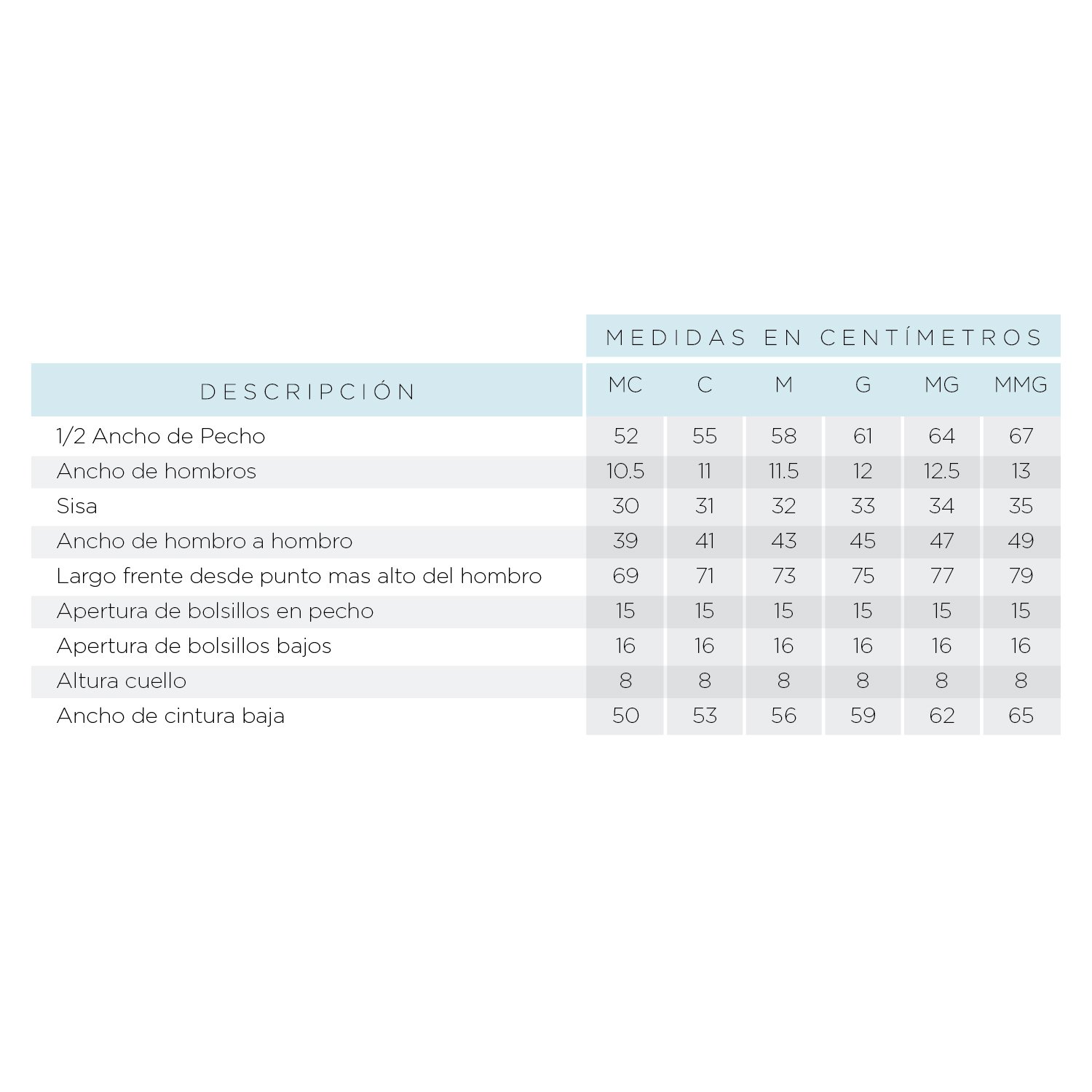 El mismo cuenta con tres bolsillos con cierre, dos laterales inferiores y uno lateral derecho superior. La confección es una de las características de esta prenda, utilizando tapa costuras y detalles en sus terminaciones tanto exterior como interior. En el extremo superior del cierre, posee una solapa cobertora. El chaleco posee cuello alzado que proporciona protección y comodidad.