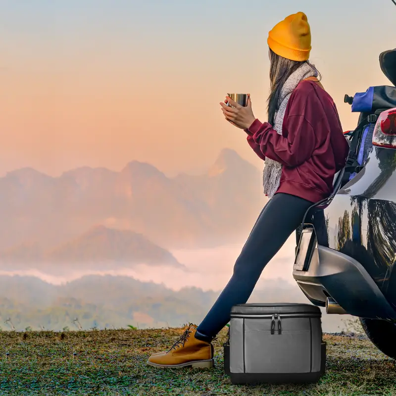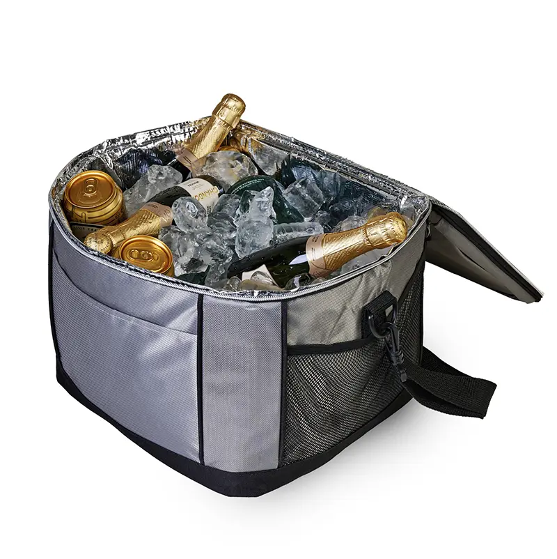 Realizado en 600D Polyester y 420D Dobby. Interior en aluminio. Compartimiento principal con doble cierre y bolsillo frontal con velcro. Medidas: 34,5 x 31 x 29,5 cm. Capacidad: 31,5 Lts. Foto ilustrativa, no incluye bebida.