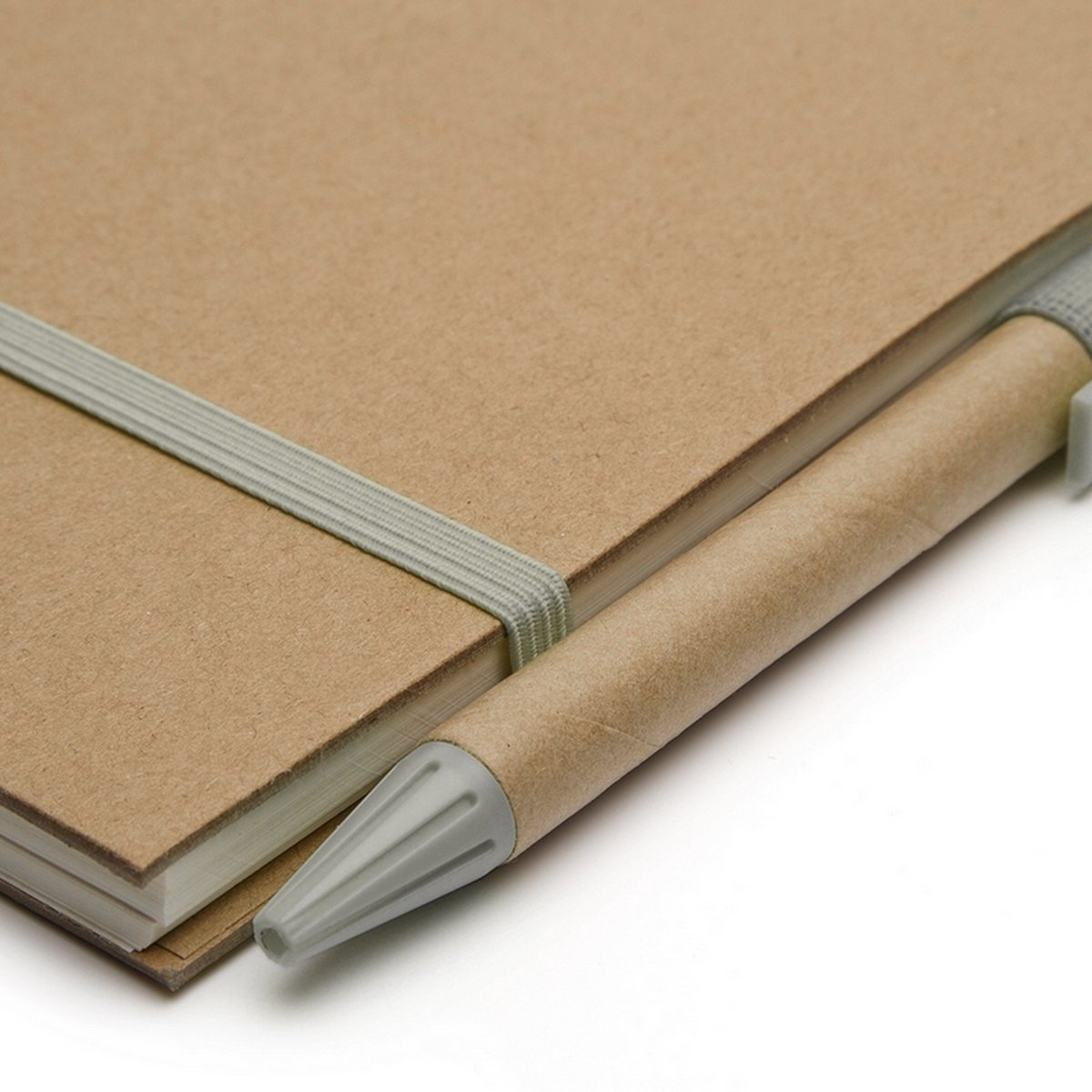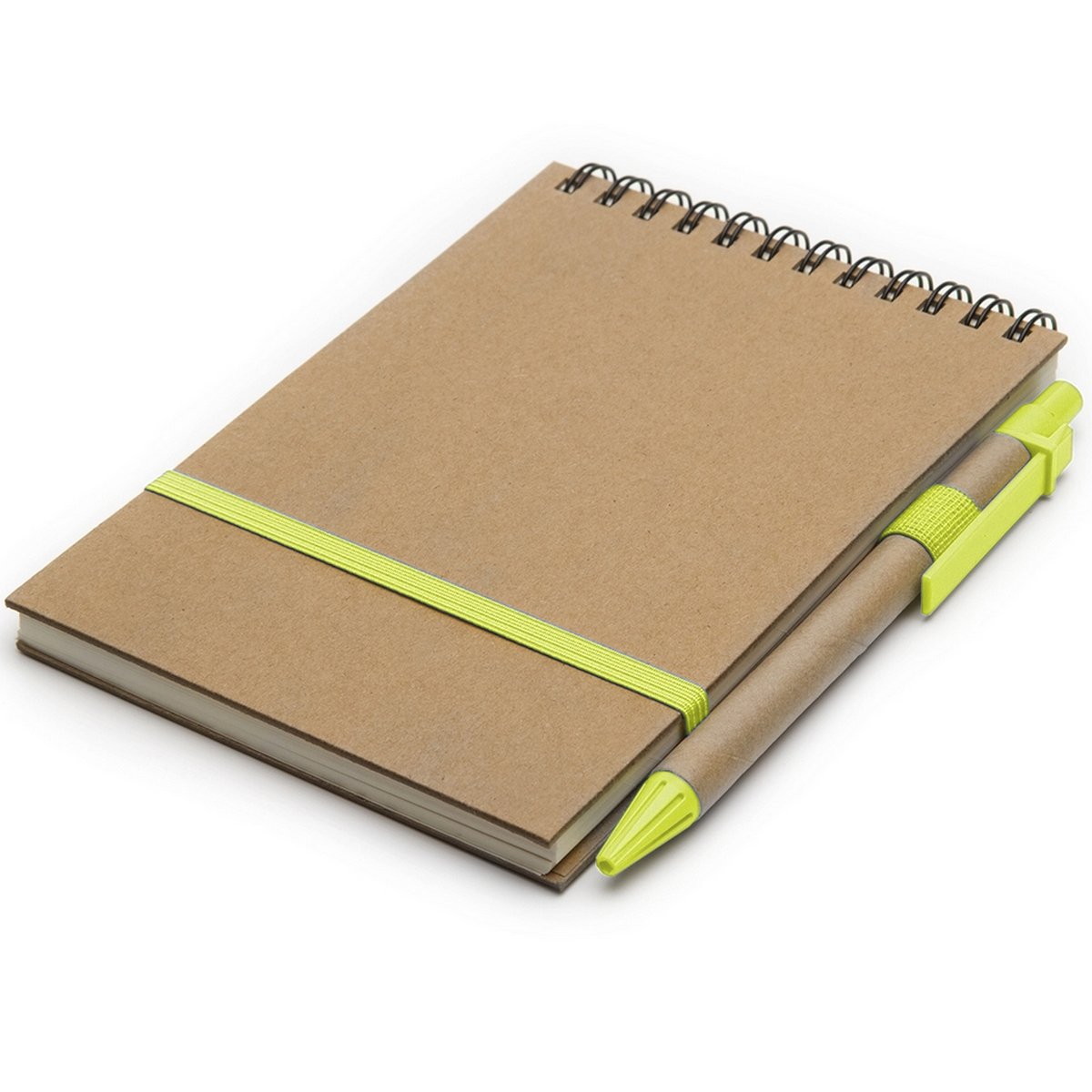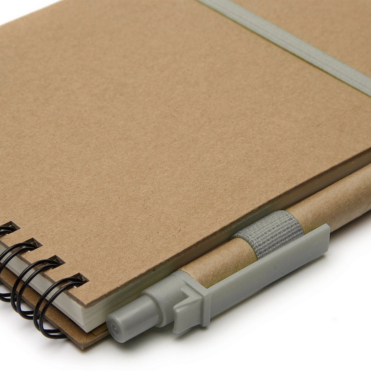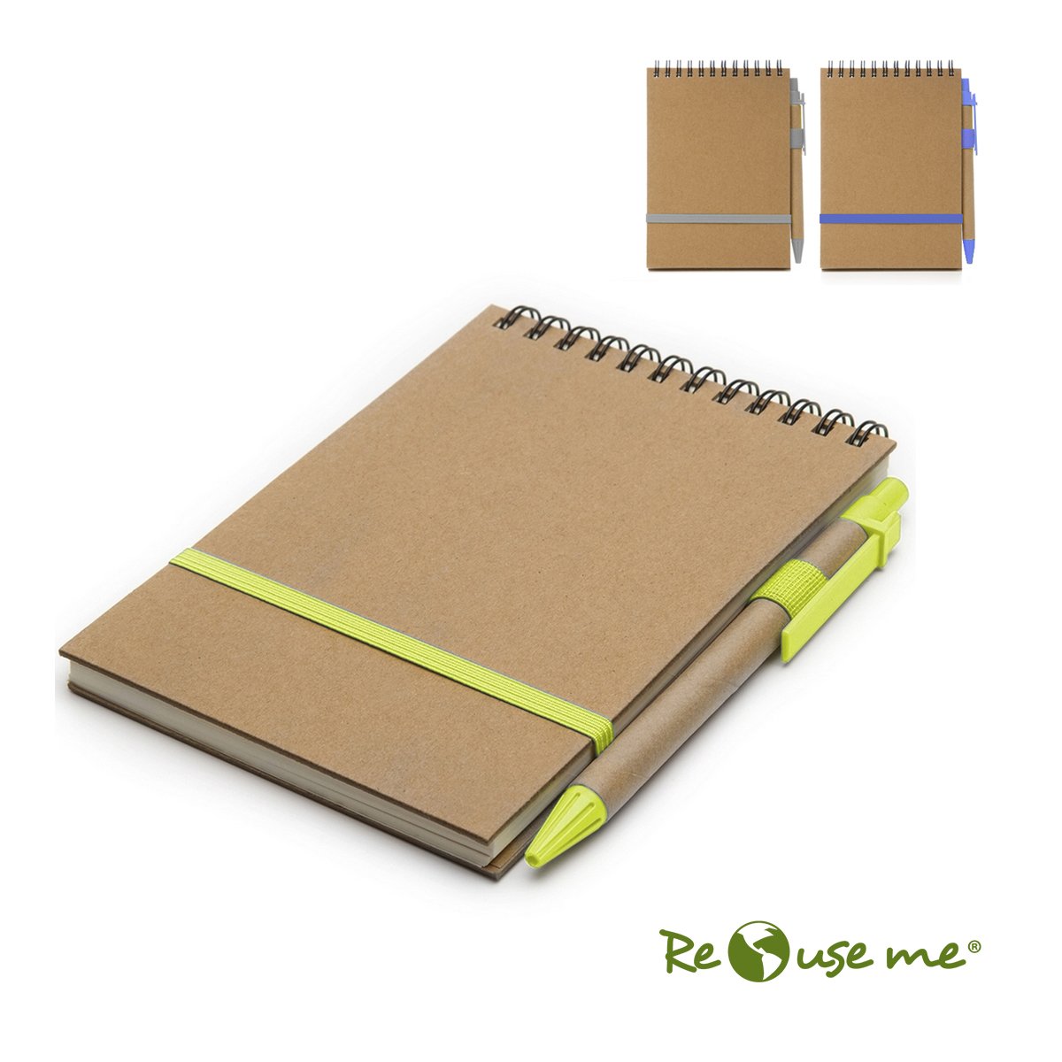 Cuaderno con 72 hojas lisas de 80 gramos anillado con elástico y porta bolígrafo. Tapa dura elaborada en cartón reciclado. Incluye bolígrafo con pulsador. Medida: 10,5 x 15 cms. Re use me