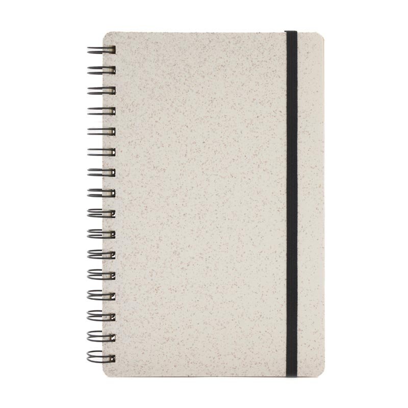 Cuaderno anillado de 80 hojas lisas de 70gr. Su tapa está confeccionada en Wheat Straw, pasta de tallo de trigo, un material sustentable que reduce el consumo de plásticos vírgenes. Cuenta con cierre elástico color negro.