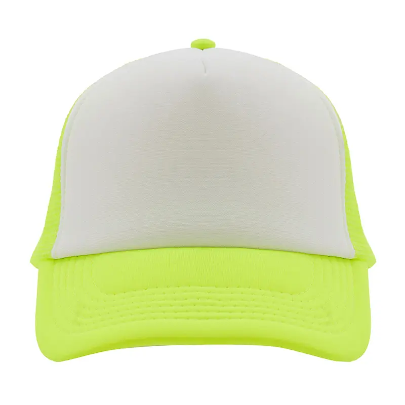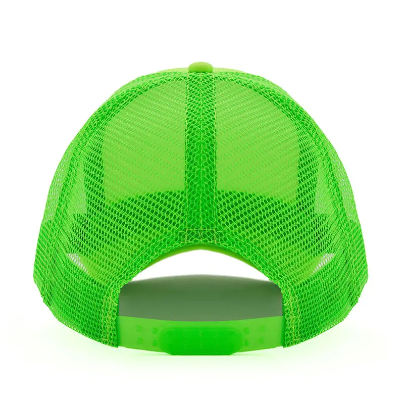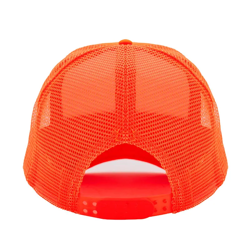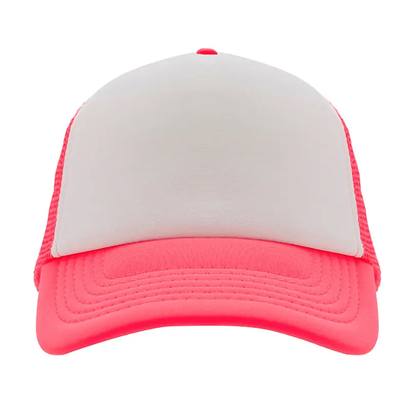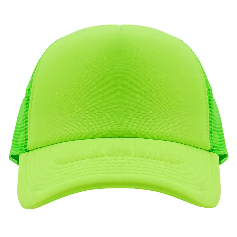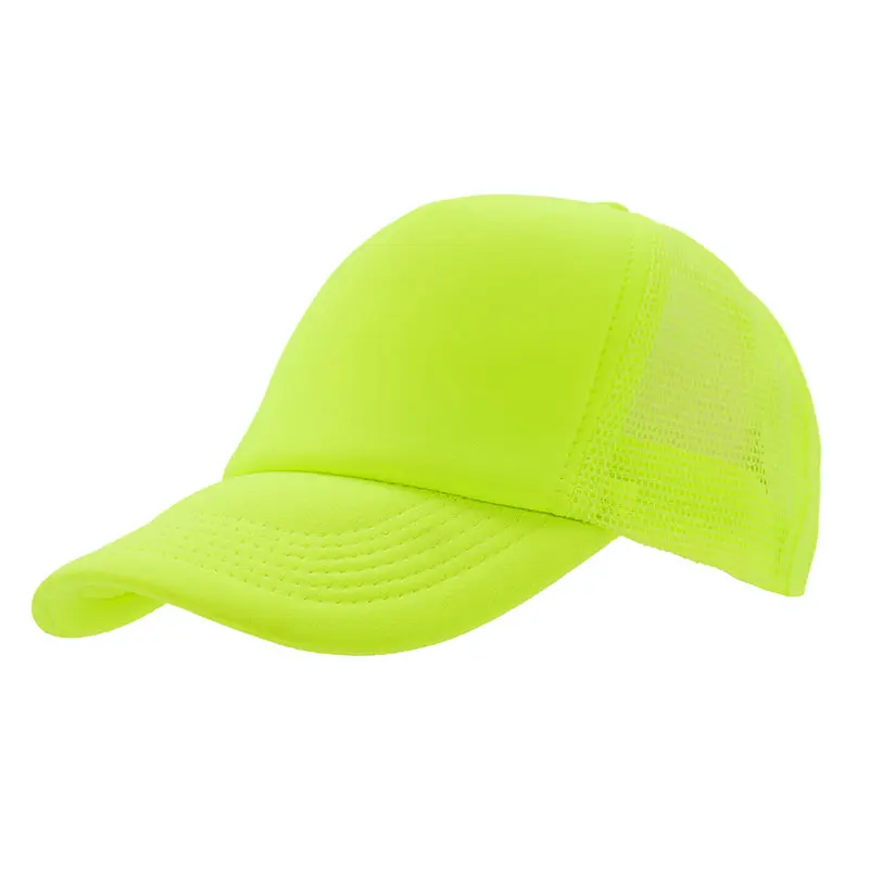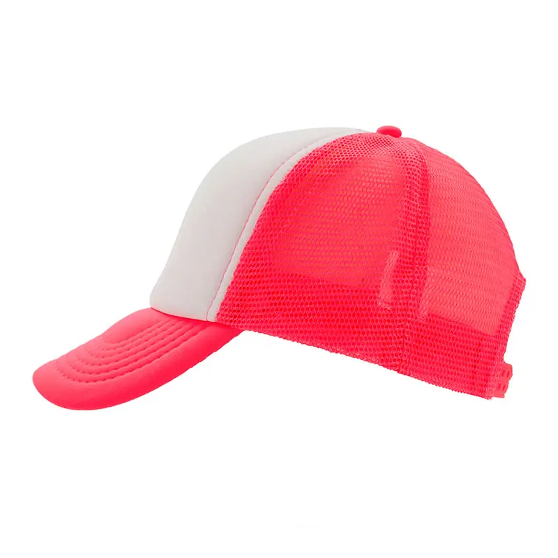 Gorro de 5 paneles en poliéster con parte trasera de tela de red. Disponible en colores fluorescentes: rosa, verde, amarillo, naranja y combinaciones de estos con blanco. Ajuste con broche plástico. Tahg.