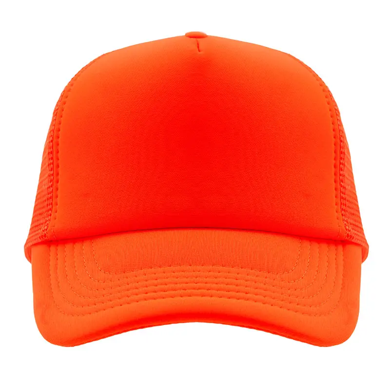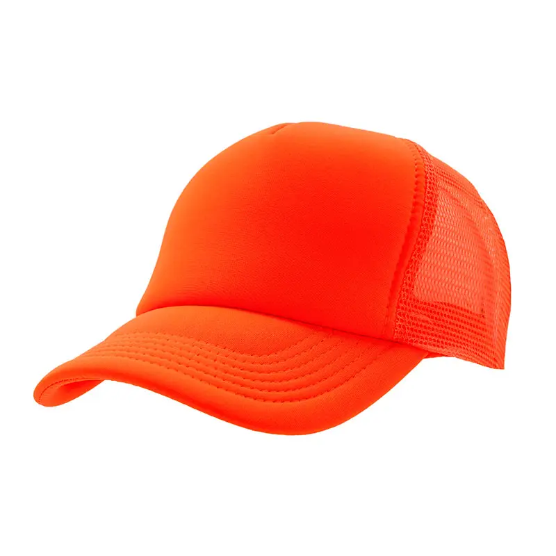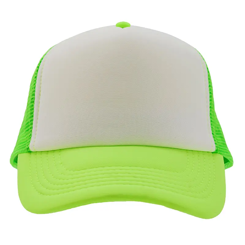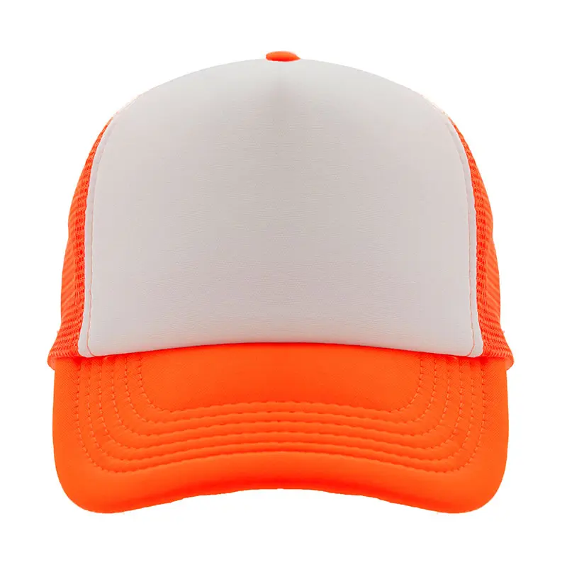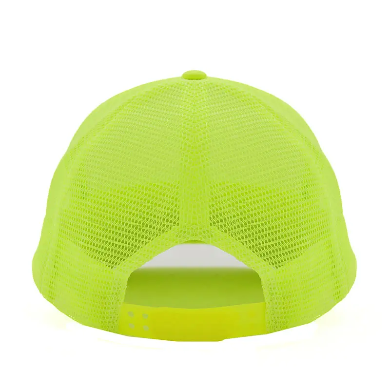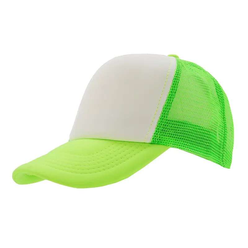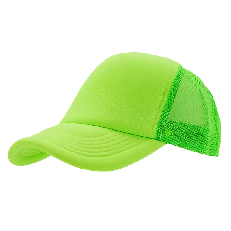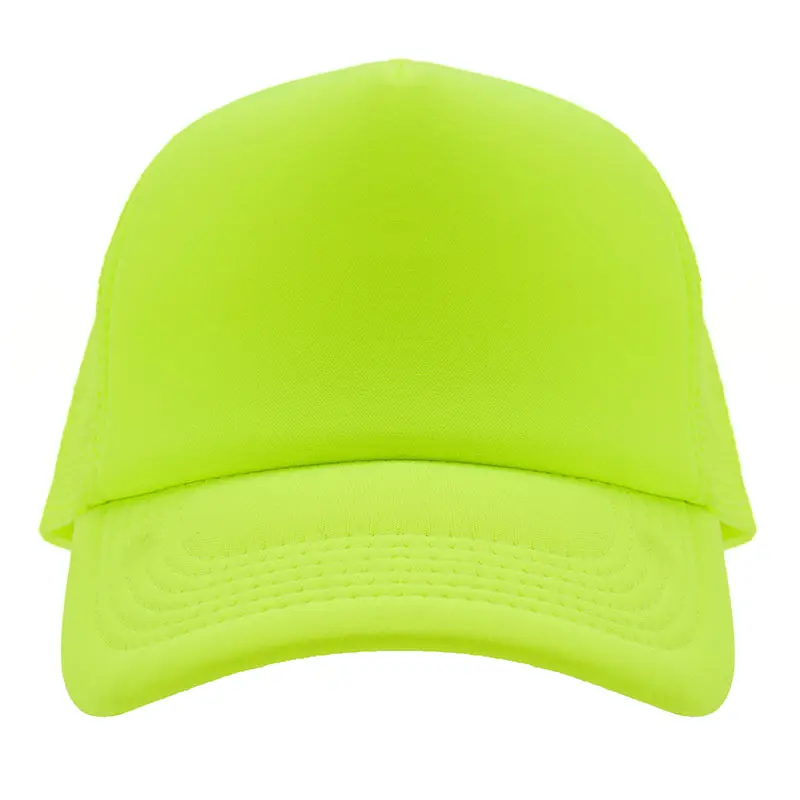 Gorro de 5 paneles en poliéster con parte trasera de tela de red. Disponible en colores fluorescentes: rosa, verde, amarillo, naranja y combinaciones de estos con blanco. Ajuste con broche plástico. Tahg.