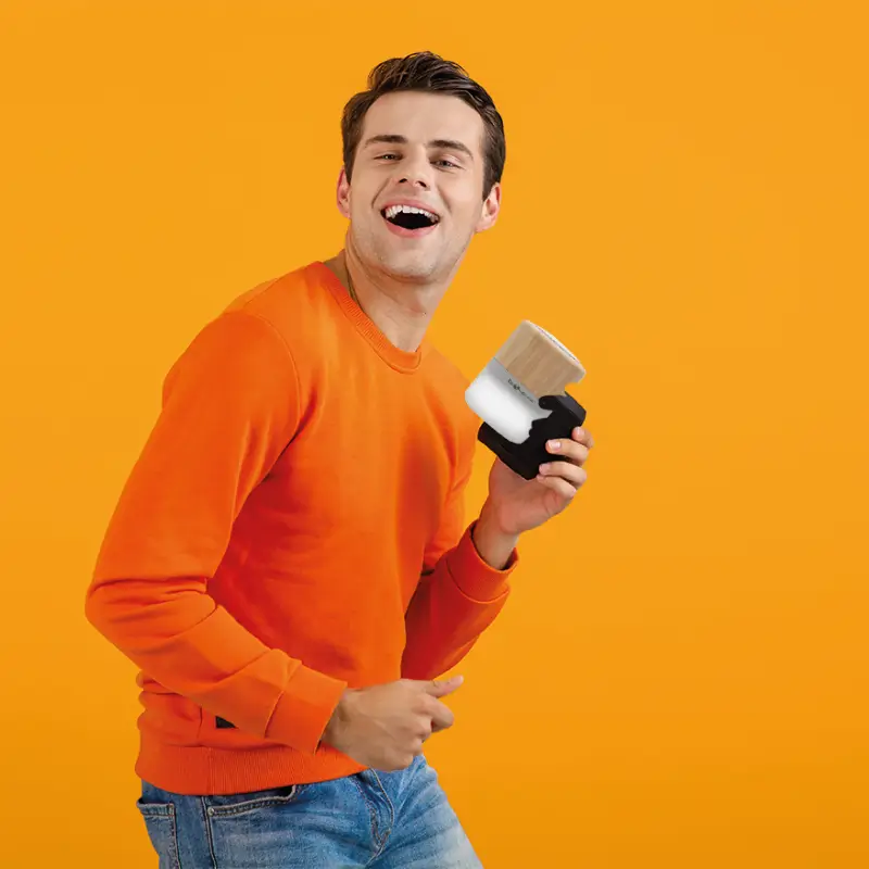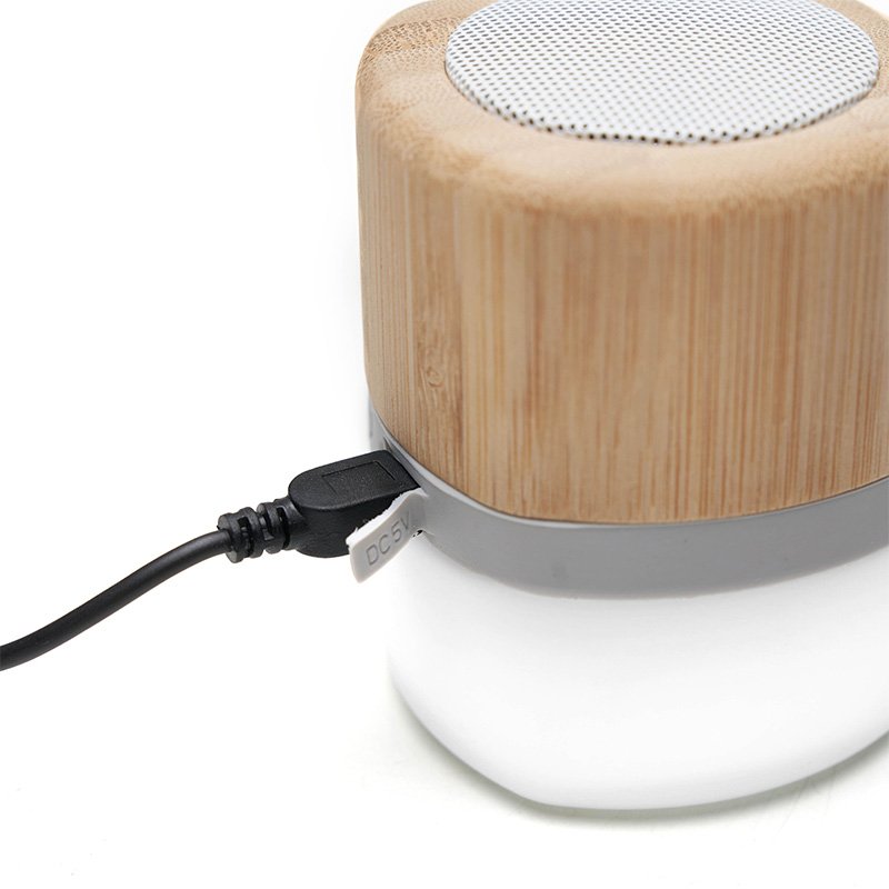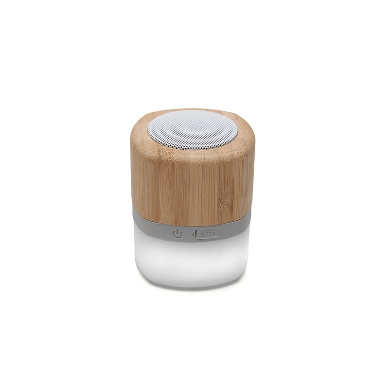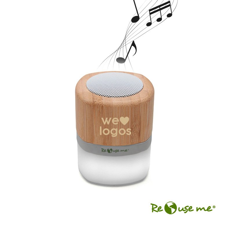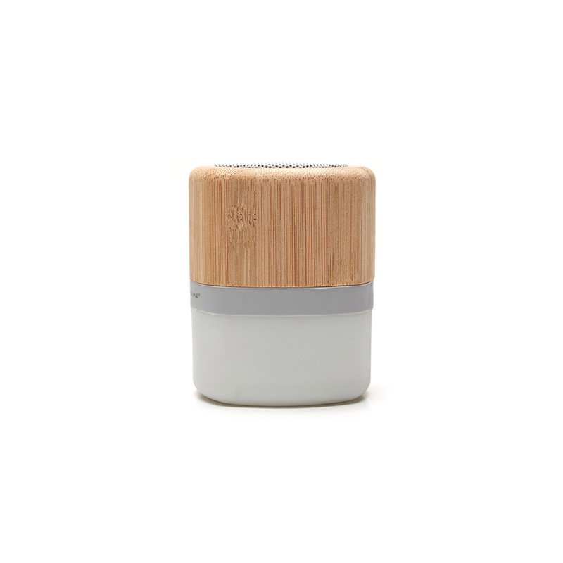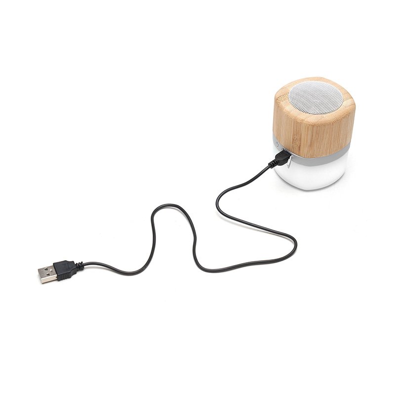 Parlante portátil con tecnología Bluetooth. Realizado en combinación de ABS con Silicona y bamboo, con iluminación en la base. Características técnicas: Batería de 300mAh | Poder del parlante: 3W | Frecuencia: 200Hz-20KHz. Conexión: 5V / 500mA | Distancia de alcance: 10 Metros | Peso 150gr | Medidas: 6 x 6 x 7,5 cm.