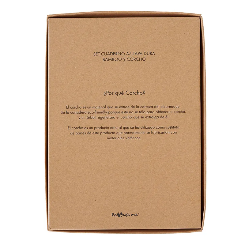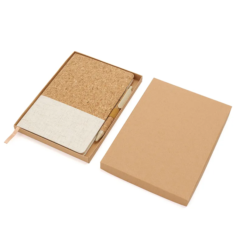 Cuaderno A5 de tapa dura hecho de corcho natural y tela ecológica. Fabricado con materiales sostenibles como corcho, algodón y papel reciclado, cuenta con marcador de cinta, soporte para bolígrafo y bolígrafo incluido con cuerpo de papel envuelto en corcho y detalles en fibra de trigo. Es ideal para tomar notas en reuniones, estudios, planificación diaria o como regalo corporativo con conciencia ecológica.