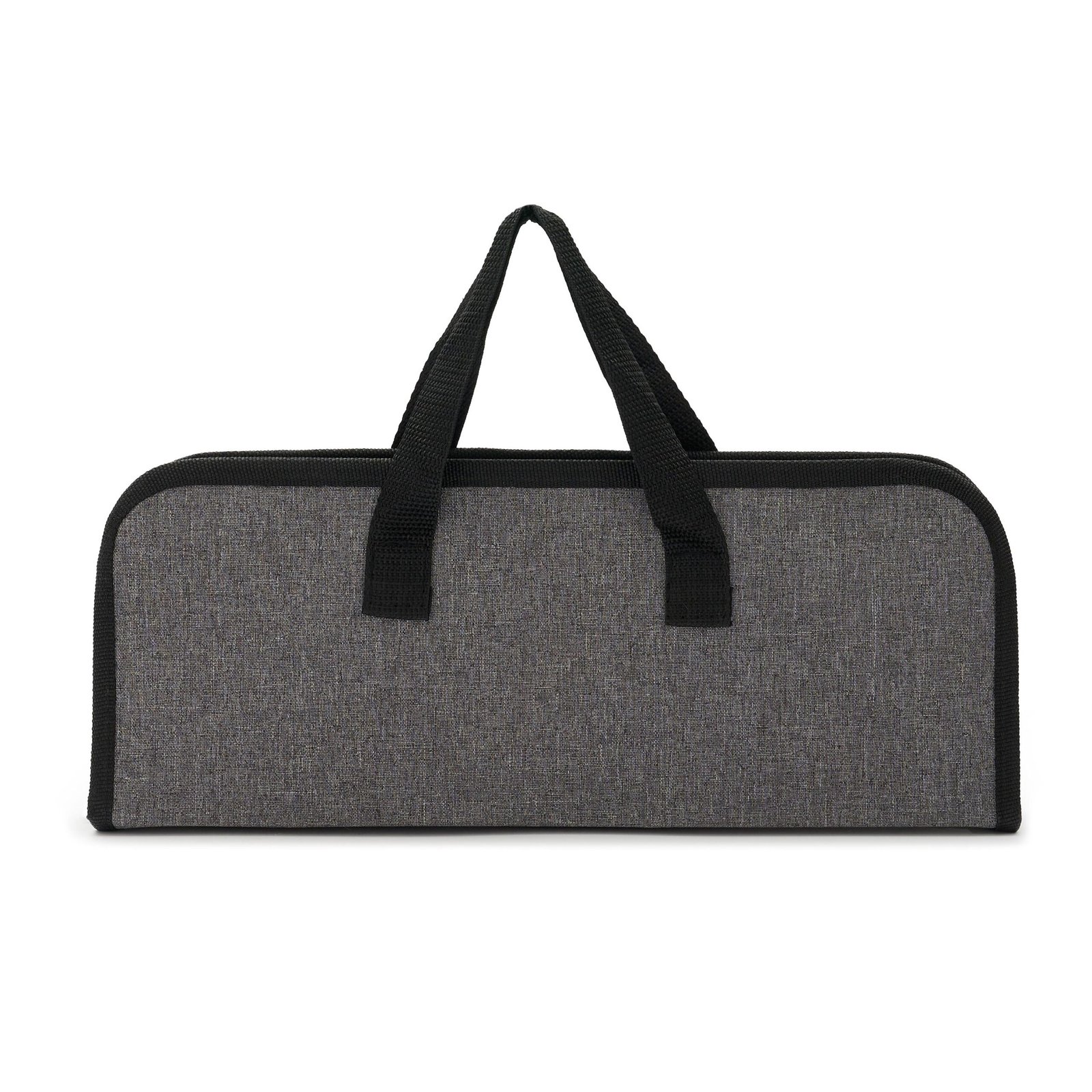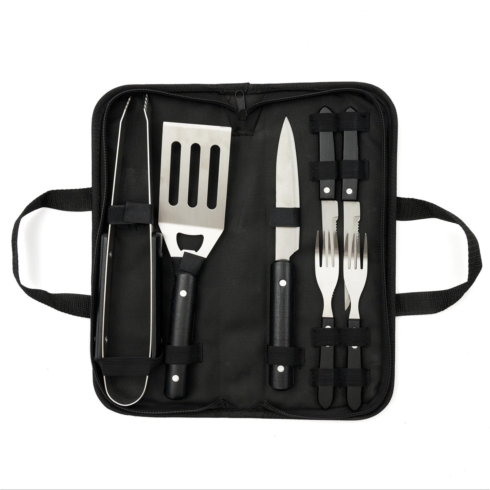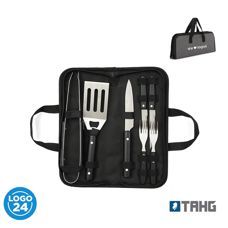Set de asado con estuche de polyester y nylon color gris. Contiene: 2 juegos de cuchillo y tenedor, 1 pinza, 1 cuchillo asador y 1 espátula. Todas las piezas cuentan con mango de madera. Producto aprobado por el INAL para el contacto con alimentos. Tahg.