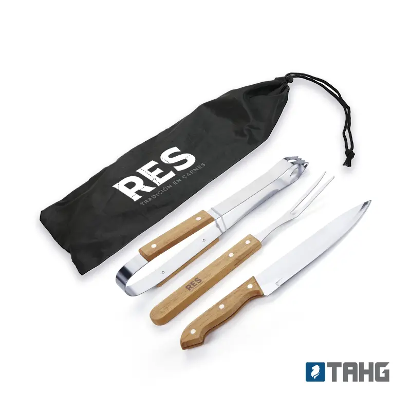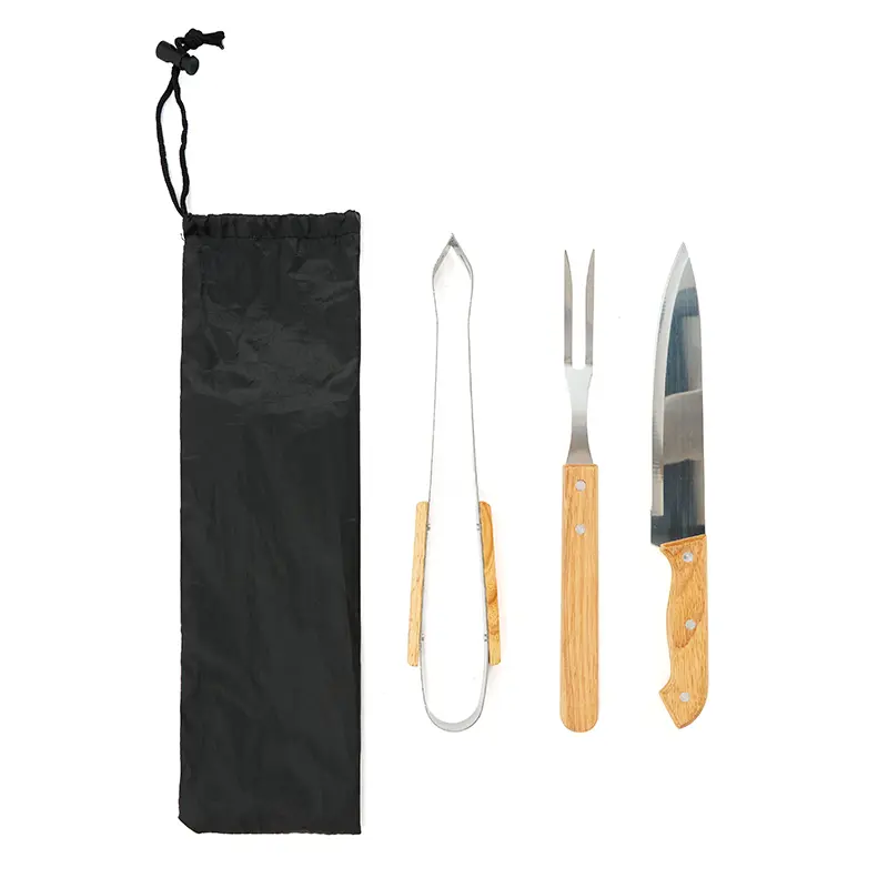 Set de asado con cuchillo, tenedor y pinza. Fabricado en madera de hevea y acero inoxidable 420. Contiene cuchillo, tenedor trinchador , pinza para asado y bolsa de guardado de nylon. Es ideal para manipular cortes de carne con precisión y comodidad durante la parrilla o asados al aire libre. Tahg.