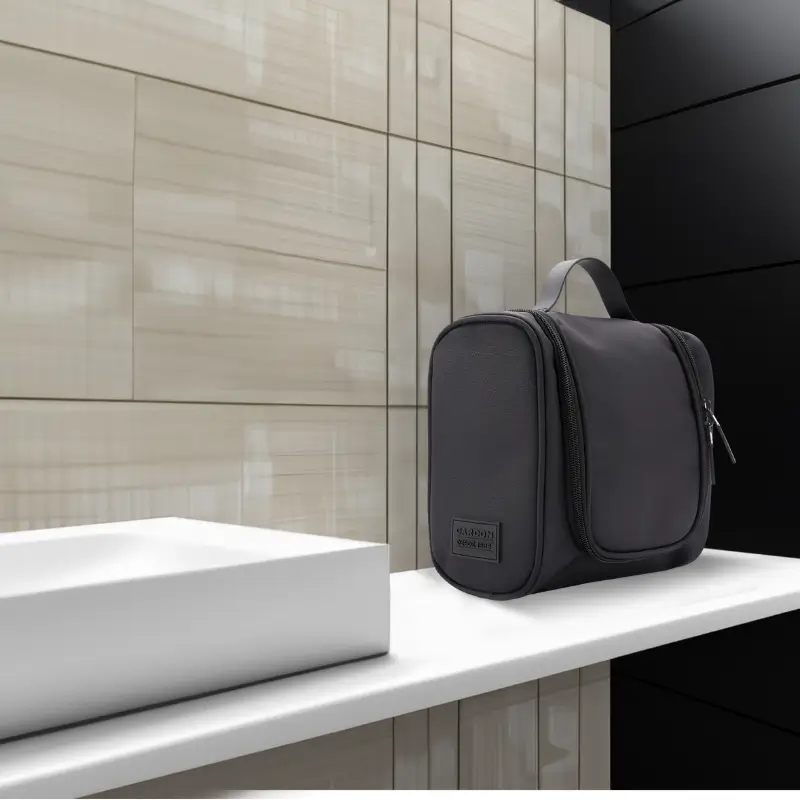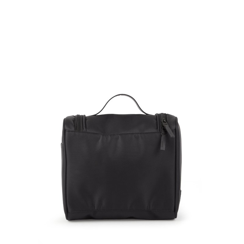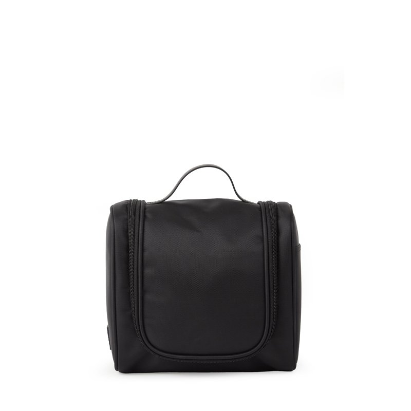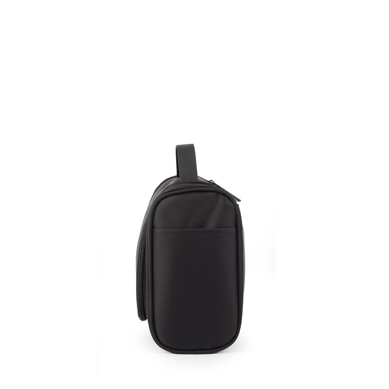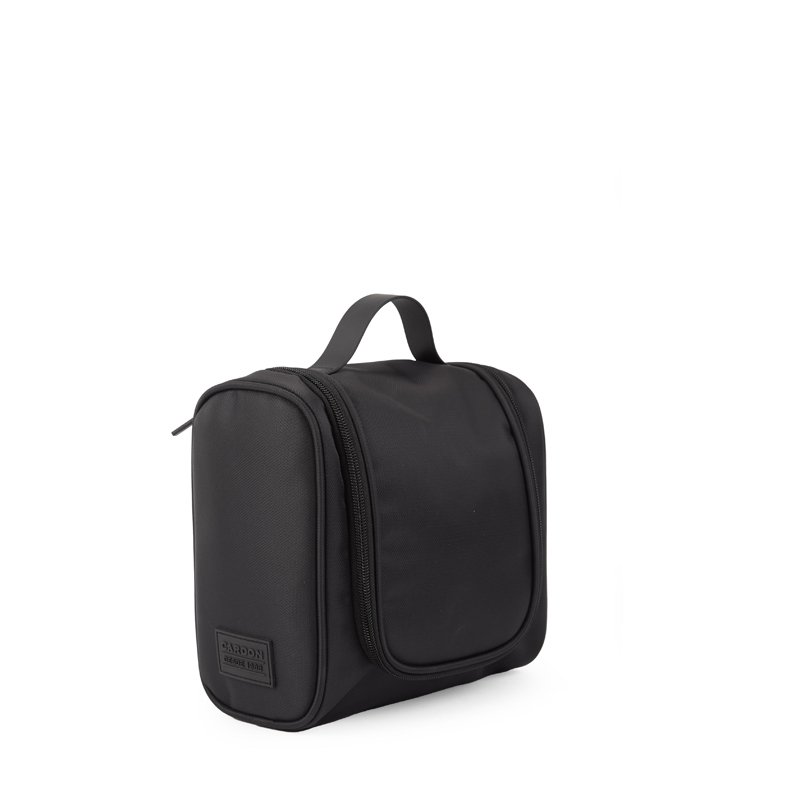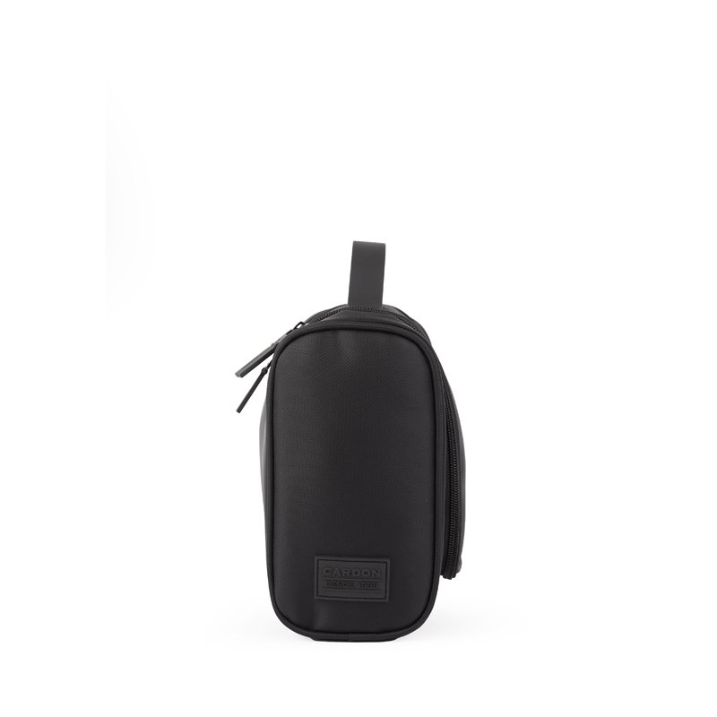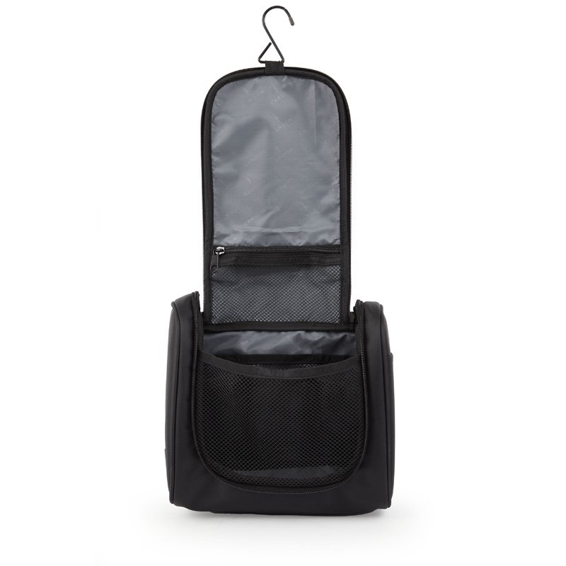 Neceser confeccionado en Polyester, con cinta de agarre para facilitar su transporte, cierre en tono y cabezal negro. Cuenta con un único compartimiento con cierre de apertura en U. Gancho interior metálico color negro para colgar, 3 bolsillos internos de red y un bolsillo interno de red con cierre independiente. Posee un bolsillo externo lateral. Interior forrado en gris pantone. Dimensiones: 21 x 23 x 12 cm (Alto x Longitud x Ancho). Capacidad: 6L. Cardon.